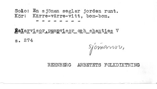 //// Soäo: En sjöman seglar jorden runt. //// Kör: Kärre-värre-vitt, bom-bom. //// ^alarvl^sor^jpum^yis_ooch_shantj^es. V //// ' ***' //// s. 274 //// REHNBERG ARBETETS FOLKDIKTNING ////