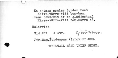 //// En sjöman seglar jorden runt //// Kärre-värre-vitt bom-bom. //// Hans hemkomst är en glädjestund //// Kärre-värre-vitt bom+Hurra så. //// - * //// Halarvisa //// Sid.271 4 str. ^ b^^MtV ^ //// f-, ' <! //// Jfr.Aug.bondesons Visbok nr.288. //// ^ STERNWALL SÅNG UNDER SEGEL. ////