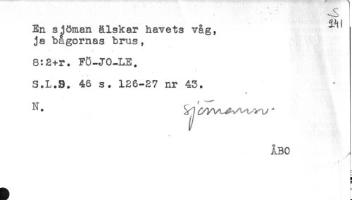 //// En sjöman älskar havets våg, //// ja bågornas brus, //// * * //// 8:2+r. FÖ-JO-LE. //// - //// -V //// S.L.8. 46 s. 126-27 nr 43. ////