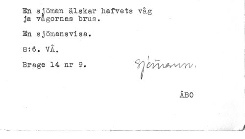 //// En sjöman älskar hafvets våg //// ja vågornas brus. //// < //// En sjömansvisa. //// 8:6. VA. //// i //// ) //// f //// Brage 14 nr 9. ' //// ÅBO ////