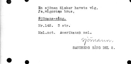 //// En sjöman älskar havets våg? //// Ja,vågornas brus, //// Sjömans-sång. //// Nr.142. 5 str. //// Mel.not. Amerikansk mel. //// o - //// S^DBERG SÅNG DEL 2. ////