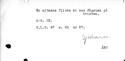 //// En sjömans flicka är som fågelen på //// kvisten, //// 2:6. EE. //// S.L.S. 47 s. 60 nr 57. //// ! ////