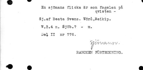 //// En sjömans flicka är som fogelen på //// qvisten - //// * //// Sj.af Beata Svens. W8rå,Reikip. //// W.3.4 n. SjOb.? - m. //// Del II nr 776. //// RANCKEN FÖRTECKNING. //// ! ////