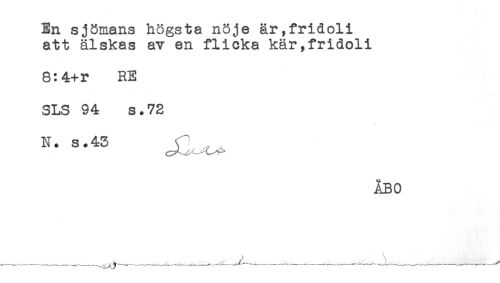 //// En sjömans högsta nöje är,fridoli //// att älskas av en flicka kär,fridoli //// 8:4+r RE //// SLS 94 s.72 //// N. s.43 _ _ //// ÅBO ////