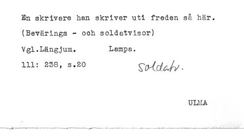 //// En skrivare han skriver uti freden så här. //// * //// (Bevärings - och soldatvisor) //// Vgl.Längjum. Lampa. //// 111: 238, s.20 //// ULMA ////