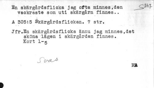 //// En skärgårdsflicka jag ofta minnes,den ^ //// vackraste som uti skärgårn finnes.. //// ... . * < * * //// ^ t. , //// t //// A 505:5 Skärgårdsflickan. 7 str. //// Jfr.En skärgårdsflicka ännu jag minnes,det //// sköna lägen i skärgården finnes. //// Kort 1-g //// j //// RA //// i //// t //// i ////
