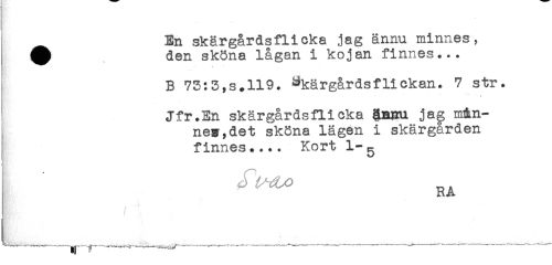 //// En skärgårdsflicka jag ännu minnes, //// ^ den sköna lågan i kojan finnes... //// B 73:3,s.119. Skärgårdsflickan. 7 str. //// * //// Jfr.En skärgårdsflicka ännu jag min- //// nes, det sköna lägen i skärgarden //// finnes.... Kort 1-g //// ' ^ RA //// < //// W i? ////
