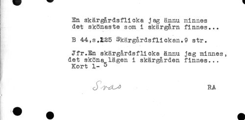 //// En skärgårdsflicka jag ännu minnes //// det skönaste som i skärgårn finnes... //// ! ' * //// B 44,s.225 Skärgårdsflickan.9 str. //// Jfr.En skärgårdsflicka ännu jag minnes, //// det sköna^lägen i skärgården finnes... //// Kort 1- 5 //// RA //// ! ////