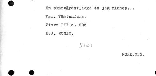 //// En skärgårdsflicka än jag minnes... //// Vsm. Västanfors. //// Visor III s. 803 //// E.U. 20310. //// . //// NORD.MUS. //// - ////
