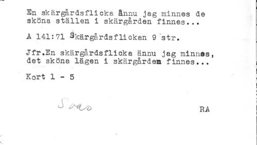 //// En skärgårdsflicka ånnu jag minnes de //// sköna ställen i skärgården finnes... //// <* //// A 141:71 Skärgårdsflickan 9 str. //// Jfr.En skärgårdsflicka ännu jag minnes, //// det sköna lägen i skärgårdem finnes... //// ' ...... //// Kort 1-5 //// ) //// i //// ^ RA ////