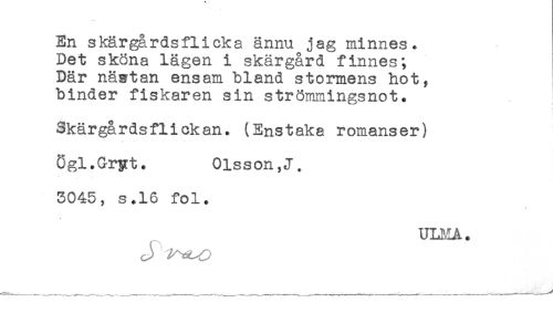 //// En skärgårdsflicka ännu jag minnes. //// Det sköna lägen i skärgård finnes; //// Där nästan ensam bland stormens hot, //// binder fiskaren sin strömmingsnot. //// Skärgårdsflickan. (Enstaka romanser) //// 3gl.Gryt. Olsson,J. //// 3045, s.16 fol. //// ULMA. ////