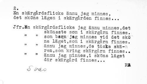 //// En skärgårdsflicka ännu jag minnes, //// det sköna lägen i skärgården finnes... //// Jfr.En skärgårdsflicka jag ännu minnes,det //// skönaste som i skärgårn finnes. //// " " som barn jag minnes vid det skö //// na läget,som i skärgårn finnes. //// " " ännu jag minnes,de täcka skä-n //// ren,som kring skärgårn finnes.. //// " " ännu jag minnes,i sköna läget //// där skärgård finnes... //// ^ RA ////