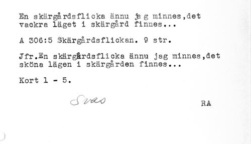 //// En skärgårdsflicka ännu js. g minnes,det //// vackra läget i skärgård finnes... //// A 506:5 Skärgårdsflickan. 9 str. //// Jfr.En skärgårdsflicka ännu jag minnes,det //// sköna lägen i skärgården finnes... //// Kort 1-5. //// (f^^ RA ////
