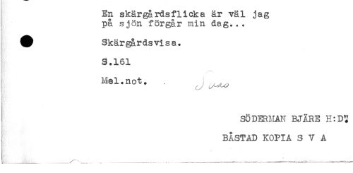//// En skärgårdsflicka är väl jag //// på sjön förgår min dag... //// ^ Skärgårdsvisa. //// S.161 //// Mel.not. . ^ ^ //// SÖDERMAN BJARE H:D? //// BÅSTAD KOPIA SVA ////