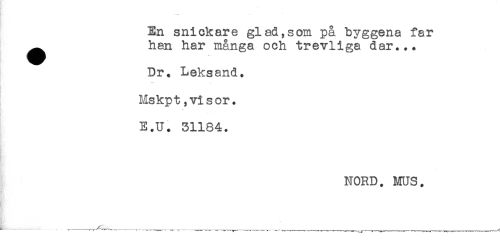 //// En snickare glad,som på byggena far //// ^ hen har många och trevliga dar... //// ^^ * * //// Dr. Leksand. //// Mskpt,visor. //// E.U. 31184. //// NORD. MUS. ////