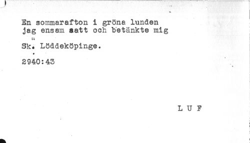 //// En sommarafton i gröna lunden //// jag ensam aatt och betänkte mig //// a //// Sk. Löddeköpinge. ! //// ' * //// 2940:43 //// * //// * //// } //// t //// ! //// t //// i //// i //// * //// L U F //// ! //// i ////