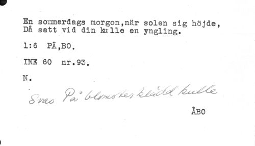 //// - - * //// En sommardags morgon,när solen sig höjde, //// Då satt vid din kille en yngling. //// 1:6 PÄ,BO. //// INE 60 nr.93. //// N. //// ÅBO ////