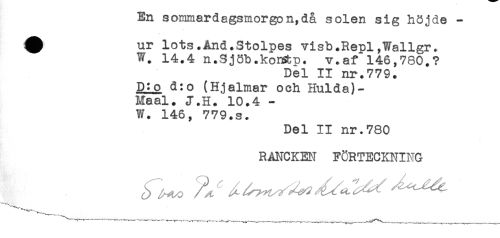 //// En sommardagsmorgon,da solen sig höjde - //// ^ ur lots.And.Stolpes visb.Repl,Wallgr. //// W. 14.4 n.Sjöb.konstn. v.af 146,780.? //// Del II nr.779. //// D:o d:o (Hjalmar och Hulda)- //// Maal. J.H. 10.4 - //// W. 146, 779.s. //// Del II nr.780 //// RANCKEN FÖRTECKNING ////