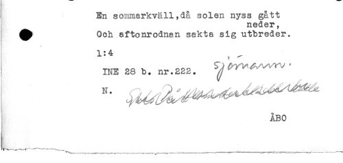 //// En sommarkväll,då solen nyss gått //// neder, //// Och aftonrodnan sakta sig utbreder. //// 1 = 4 //// INBSab. nr.222. //// ÅBO ////