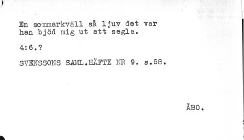 //// : //// - * * * * //// En sommarkväll så ljuv det var //// han bjöd mig ut att segla. //// . 4 i //// 4:6.? //// SVENSSONS SAHL.HÄFTE NR 9. s.68. //// ÅBO. ////