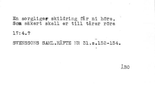 //// En sorgligey skildring får ni höra, //// Som säkert skall er till tårar röra //// 17:4.? //// SVENSSONS SAML.HÄFTE NR 31.s.152-154. //// * //// ÅBO ////