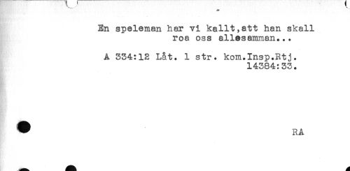 //// En speleman har vi kallt,att han skall //// roa oss allesamman... //// A 354:12 Låt. 1 str. kom.Insp.Rtj. //// 14384:33. //// HL ////