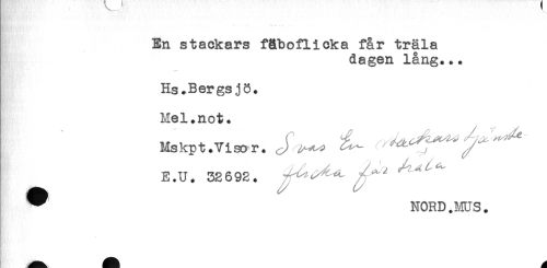 //// En stackars fåboflicka får träla //// dagen lång... //// -* * //// Hs.Bergsjö. //// Mel.not. //// Mskpt.Visor. //// E.U. 32692. ^ ' " //// ^ NORD.MUS. ////