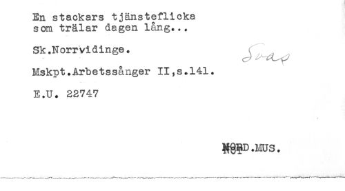 //// En stackars tjänsteflicka //// som trälar dagen lång... //// Sk.Norrvidinge. //// Mskpt.Arbetssånger II,s.141. //// E.U. 22747 //// RggD .ms. ////