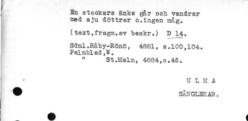 //// En stackars änka går och vandrar //// med sju döttrar o.ingen måg. //// (text,fragm.av beskr.) D 14. //// 4' //// Sdml.Råby-Rönö, 4881, s.100,104. //// Palmblad,W. //// " St.Malm, 4884,s.46. //// U L M A //// ^ SÅNGLEKAR. ////