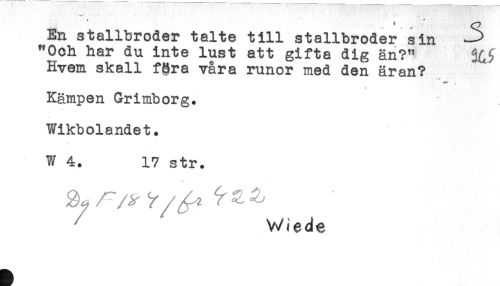 //// En stallbroder talte till stallbroder sin //// "Och har du inte lust att gifta dig än?" //// Hvem skall fgra våra runor med den äran? //// Kämpen Grimborg. //// Wikbolandet. //// w 4. 17 str. ////