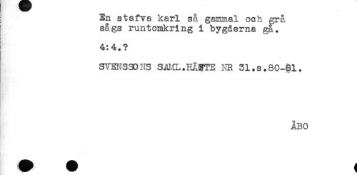 //// En stafva karl så gammal och grå //// / sågs runtomkring i bygderna gå. //// 4:4.? //// - //// SVENSSONS SAML.HÅETE NR 31.s.80-81. //// - //// ÅBO ////