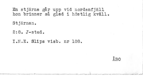 //// i //// < //// En stjärna gar upp vid nordanfjäll //// hon brinner så glad i höstlig kväll. //// } //// j //// Stjärnan. //// -* ! //// 3:8. J-stad. //// I.N.E. Slips visb. nr 108. //// t //// f //// i //// ; //// ÅBO ////