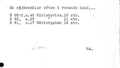 //// 5 //// r //// Ensj^järneklar afton i rosende lund,,, //// i //// B 65:2,s.45 Kärleksvisa.12 str. //// B 60, s.26 " 11 str. //// B 61, s.17 Näktergalen 12 str. //// B //// ! //// ) //// < //// ! //// J RA. ////