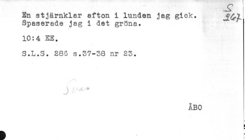 //// En stjärnklar afton i lunden jag gick. //// Spaserade jag i det gröna* //// * //// 10:4 EE. //// <* ! //// S.L.S. 286 s.37-38 nr 23. //// J /' ^ ////