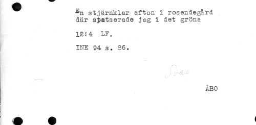 //// -^n stjärnklar afton i rosendegård //// där si)atserade jag i det gröna //// ' . . * . . - //// 12:4 LF. //// INE 94 s. 86. //// ÅBO ////