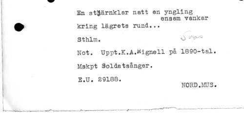 //// En stjärnklar natt en yngling //// ensam vankar //// ^ kring lägrets rund... //// Sthlm. ' - //// Not. Uppt.K.A.Kignell på 1890-tal. //// -.. //// Mskpt Soldatsånger. //// E.U. 29188. //// NORD.MUS. ////