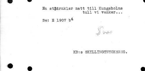 //// En stjärnklar natt till Kungsholms //// tull vi vankar... //// . * //// Se: E 1907 b^ //// - //// - //// KB:s SKILLINGTRYCKSREG. //// * ////