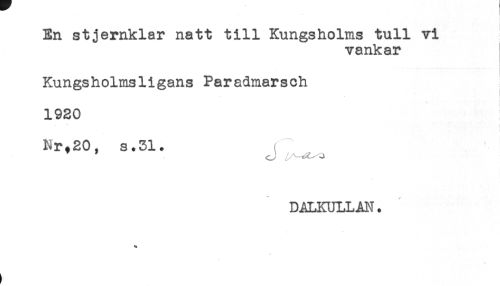 //// En stjernklar natt till Kungs holms tull vi //// vankar //// Kungsholmsligans Paradmarsch //// 1920 //// Nr,20, s.31. //// DALKULLAN. ////