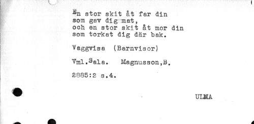 //// ^n stor skit åt far din //// ^ som gav dig mat, //// och en stor skit åt mor din //// i som torkat dig där bak. //// * //// Vaggvisa (Barnvisor) //// Vml.Sala. Magnusson,B. //// 2885:2 s.4. //// ^ ULNA //// < - - ////