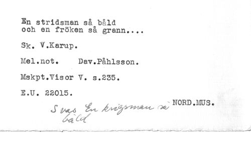 //// En stridsman så båld //// och en fröken så grann.... //// Sk. V.Karup. //// Mel.not. Dav.Påhlsson. //// Mskpt.Visor V. s.235. //// E.U. 22015. //// ^ z , NORD.MUS. //// ....----- ----____:_____----__---^-----___-_____-__..__-____..___-.< <-^ ////
