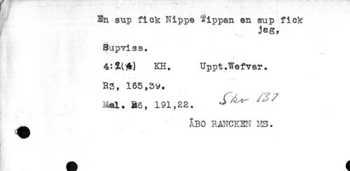 //// En sup fick Nippe Tippan en sup fick //// jag, //// Supvisa. //// <, //// KH. Uppt.Wefvar. //// v //// * -- //// R3, 165,30. //// Hal. R6, 191,22. ^^ ^ //// ^ ÅBO RåNCKEN MS. ////