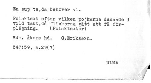 //// En sup te,dä behöver vi. //// Polsktext efter vilken pojkarna dansade i //// vild takt,då flickorna gått att få för- //// plägning. (Polsktexter) //// Sdm. Åkers hd. G.Eriksson. //// 347:59, s.29(?) //// ULMA ////