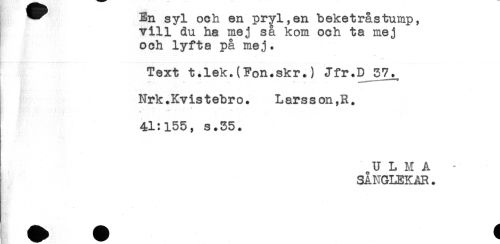 //// ^^ En syl och en pryl,en beketrastump, //// vill du ha mej så kom och ta mej //// och lyfta på mej. //// Text t.lek.(Fon.skr.) Jfr.D 37^ //// Nrk.Kvis tebro. Lars s on,R. //// * //// * **"' //// 41:155, s.35. //// U L M A - //// SÅNGLEKAR. ////