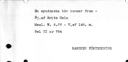 //// En synderska här kommer fram - //// 3j.af Brita Malm //// t ' //// Maal. W. 6.7? - V.af 146. m. //// .... * //// Del II nr 784 //// ^ RANCKEN FÖRTECKNING //// * ////