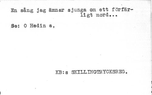 //// En sång jag ämnar sjunga om ett förfär- //// ligt mord... //// * //// Se: O Hedin a, //// KB:s SKILLINGTRYCKSREG. //// * //// ! //// ! //// * ////