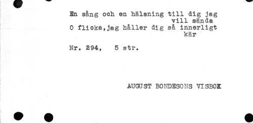 //// * //// En sång och en hälsning till dig jag //// vill sända //// ! 0 flicka,jag håller dig så innerligt //// kär //// .. //// Nr. 294, 5 str. //// - //// - //// AUGUST BONDESONS VISBOK ////