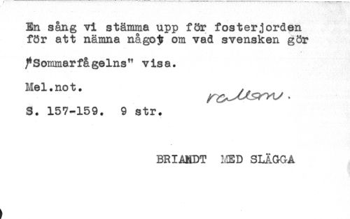 //// En sång vi stämma upp för fosterjorden //// för att nämna någojy om vad svensken gör //// ^Sommarfågelns" visa. //// Mel.not. * //// S. 157-159. 9 str* //// BRIANDT MED SLÄGGA ////