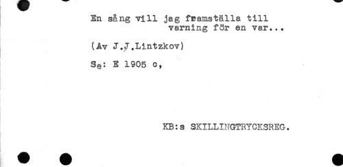 //// En sång vill jag framställa till //// varning för en var... //// t //// (Av J.^T.Lintzkov) //// Se: E 1905 c, //// - //// KB:s SKILLINGTRYCKSREG. //// - ////