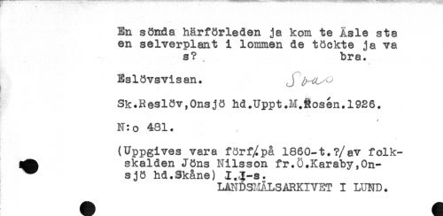 //// En sönda härförleden ja kom te Åsle sta //// en selverplant i lommen de töckte ja va //// s? bra. //// * //// Eslövsvisan. J ^t^o //// Sk.Reslöv,Ons jö hd.Uppt.M.Rosén.1926. //// * * //// N:o 481. //// (Uppgives vara förf/på 1860-1.?/av folk- //// Og^ skalden Jöns Nilsson fr.0.Karaby,On- //// ^ sjö hd.Skåne) I.g-s. //// LÅNDSldLSARKIVET I LUND. ////