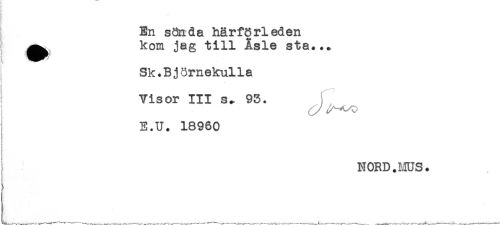 //// En sön da härförleden //// ^^ kom jag till Åsle sta... //// Sk.Björnekulla //// Visor III s. 95. //// E.U. 18960 //// i //// t? //// < //// j //// NORD.MUS. ////